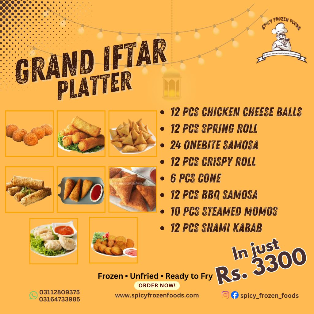 Make your Iftar truly grand with our Grand Iftar Platter. This carefully curated platter includes a variety of delicious items perfect for family gatherings, parties, or sharing with loved ones. Enjoy the convenience, taste, and premium quality of a complete Iftar experience – all for just Rs 3,300.